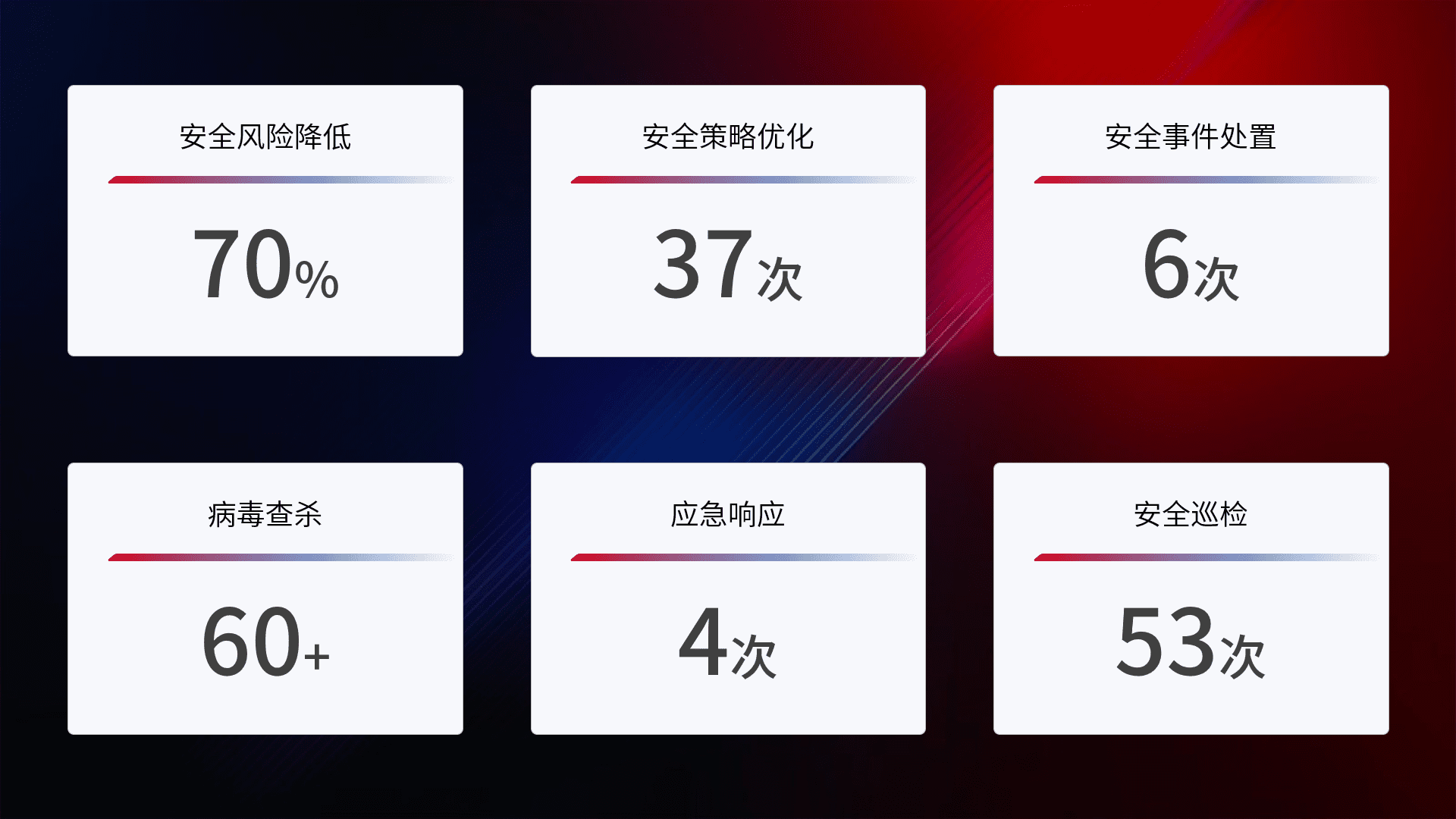 提供全面的安全事件报告体系,,,,包括处置报告、、、、周报、、、、季度和年度总结,,,结合持续监控,,,帮助客户深入了解网络安全状况。。。。